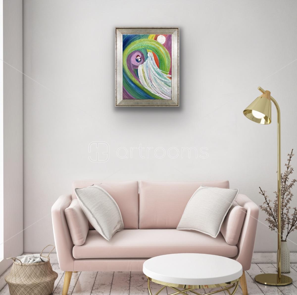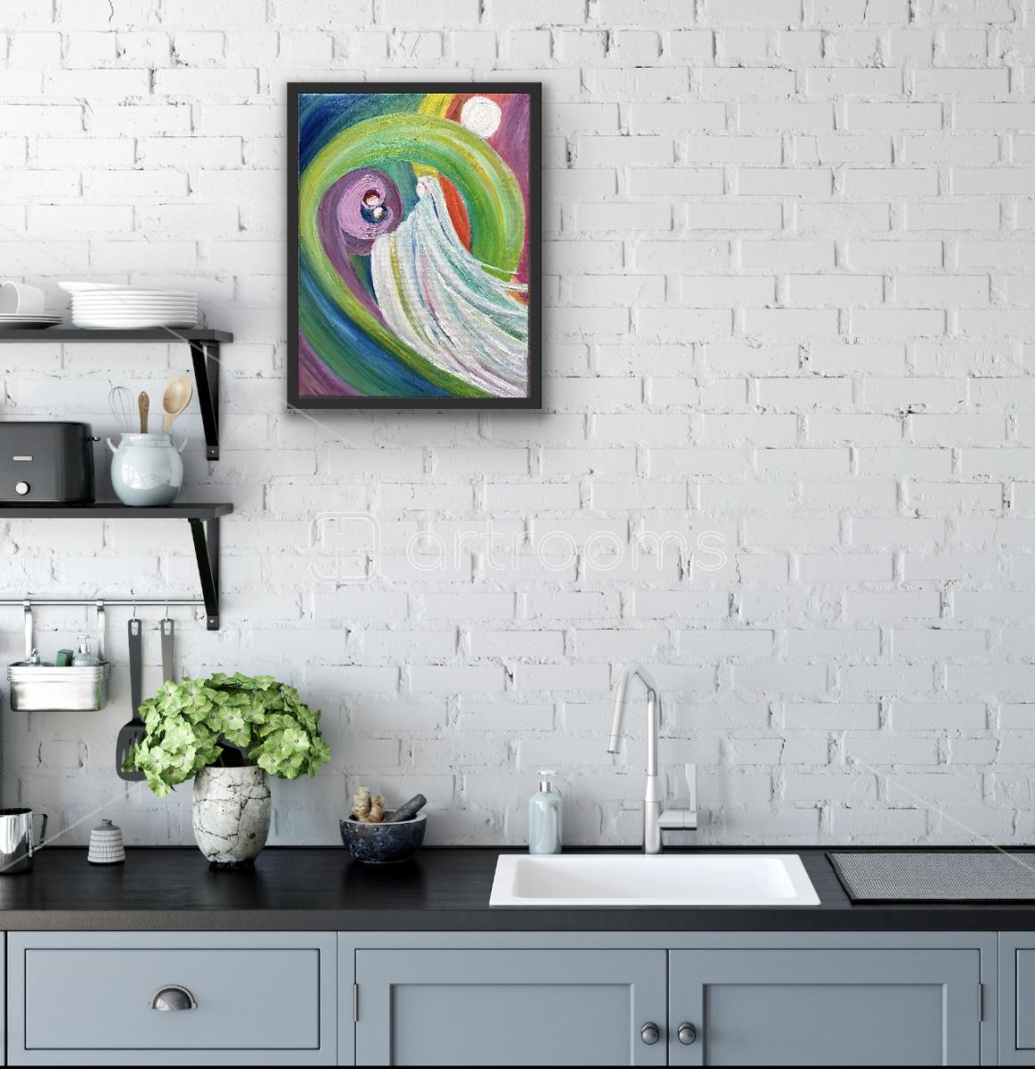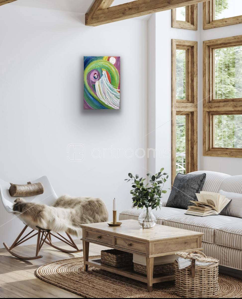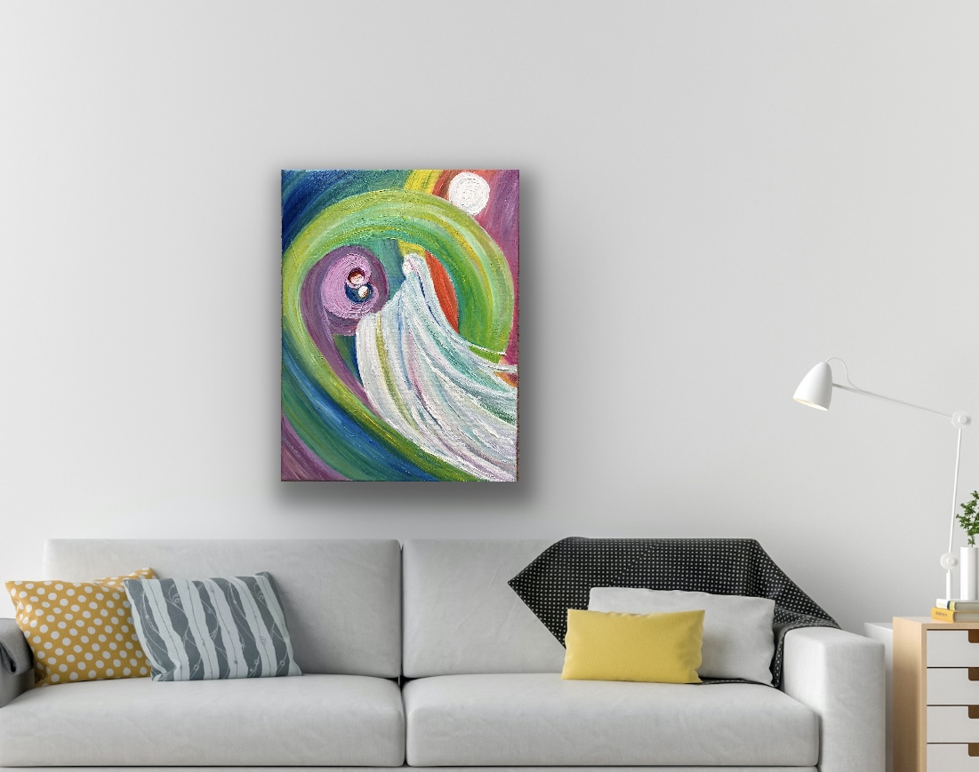 The colors in this piece deepen its message: white represents purity, healing, and divine guidance; purple symbolizes introspection, transformation, and the spiritual depth of the inner child’s wounds; green embodies growth, renewal, and the heart’s capacity to heal; blue evokes peace, wisdom, and emotional depth, reminding us that true healing comes from within. The circular motion of the composition reflects the cyclical nature of healing, where pain and love intertwine, ultimately leading to rebirth.